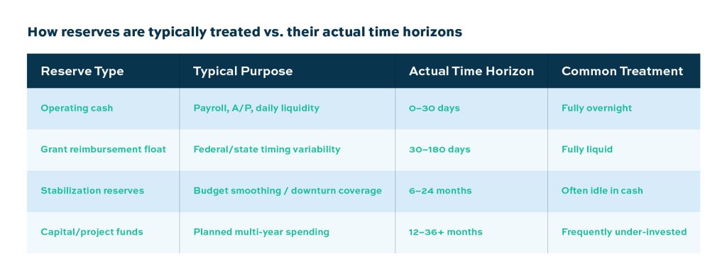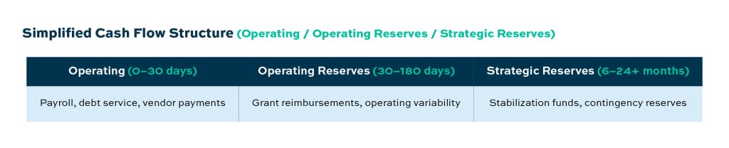 Federal funding may introduce variability in timing, but it does not typically eliminate visibility into baseline operating needs. Payroll, debt service, and core expenditures still follow relatively predictable schedules. That foundation creates an opportunity to segment reserves more precisely.