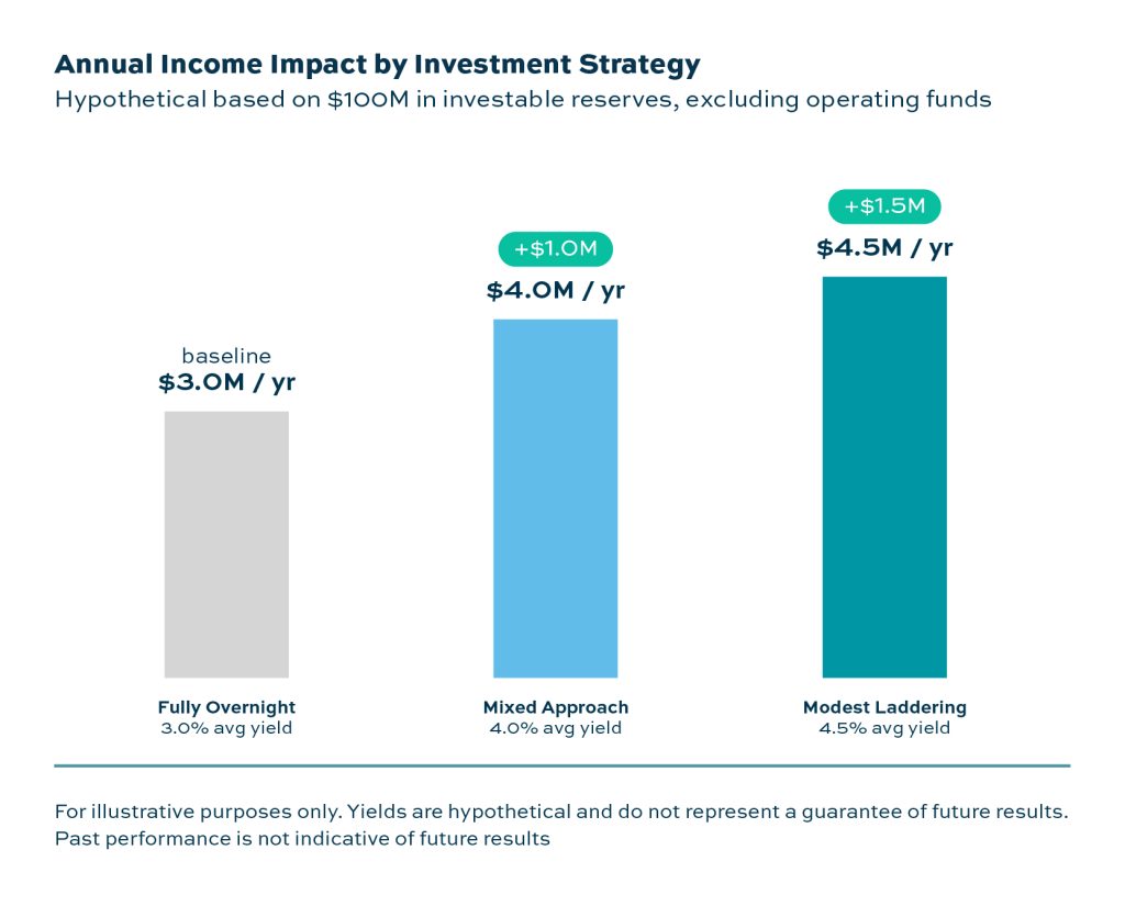 The illustration below compares three investment approaches applied to the same pool of investable reserves ($100M, excluding operating funds). Each strategy represents a different posture — from keeping all reserves in overnight accounts to extending maturities along a modest ladder. The difference in annual income shown reflects how yield changes based on how reserves are structured. The goal is not to maximize return at the expense of liquidity, but to illustrate the opportunity cost of leaving all reserves idle when only a portion genuinely needs to be.