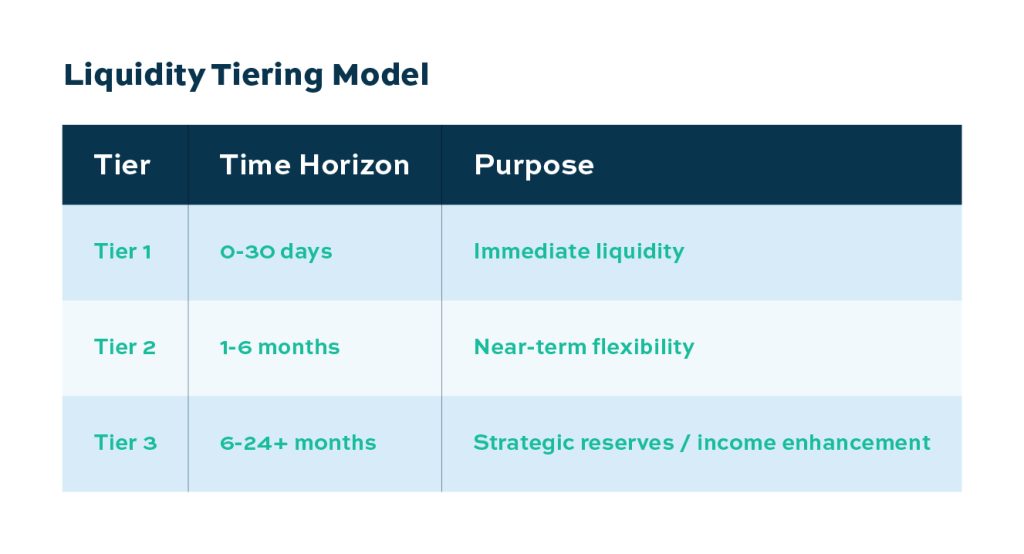 A modest laddering approach, applied to a portion of reserve balances, can help balance liquidity and income. Staggered maturities provide periodic access to cash while reducing reliance on a single rate environment. At the same time, maintaining a clearly defined liquidity tier helps ensure that near-term needs are not compromised.